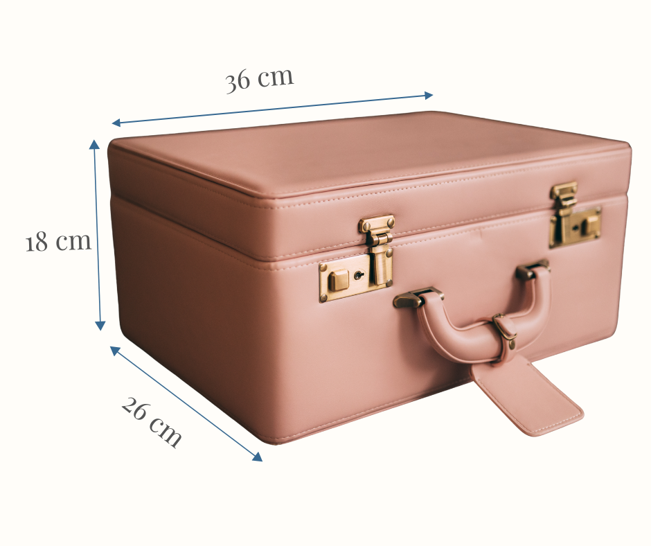 Svojim dimenzijama, kofer se savršeno uklapa u svaki prostor – dovoljno kompaktan da stane ispod kreveta, na policu ili komodu, a dovoljno upečatljiv da postane dekorativni detalj koji privlači poglede.
